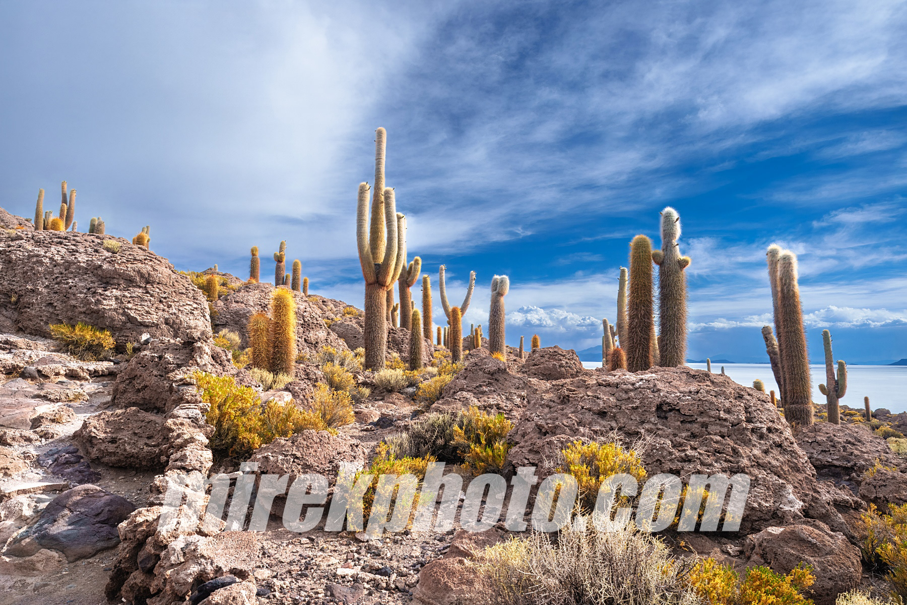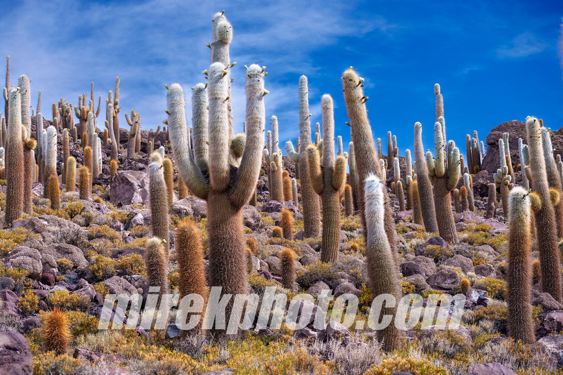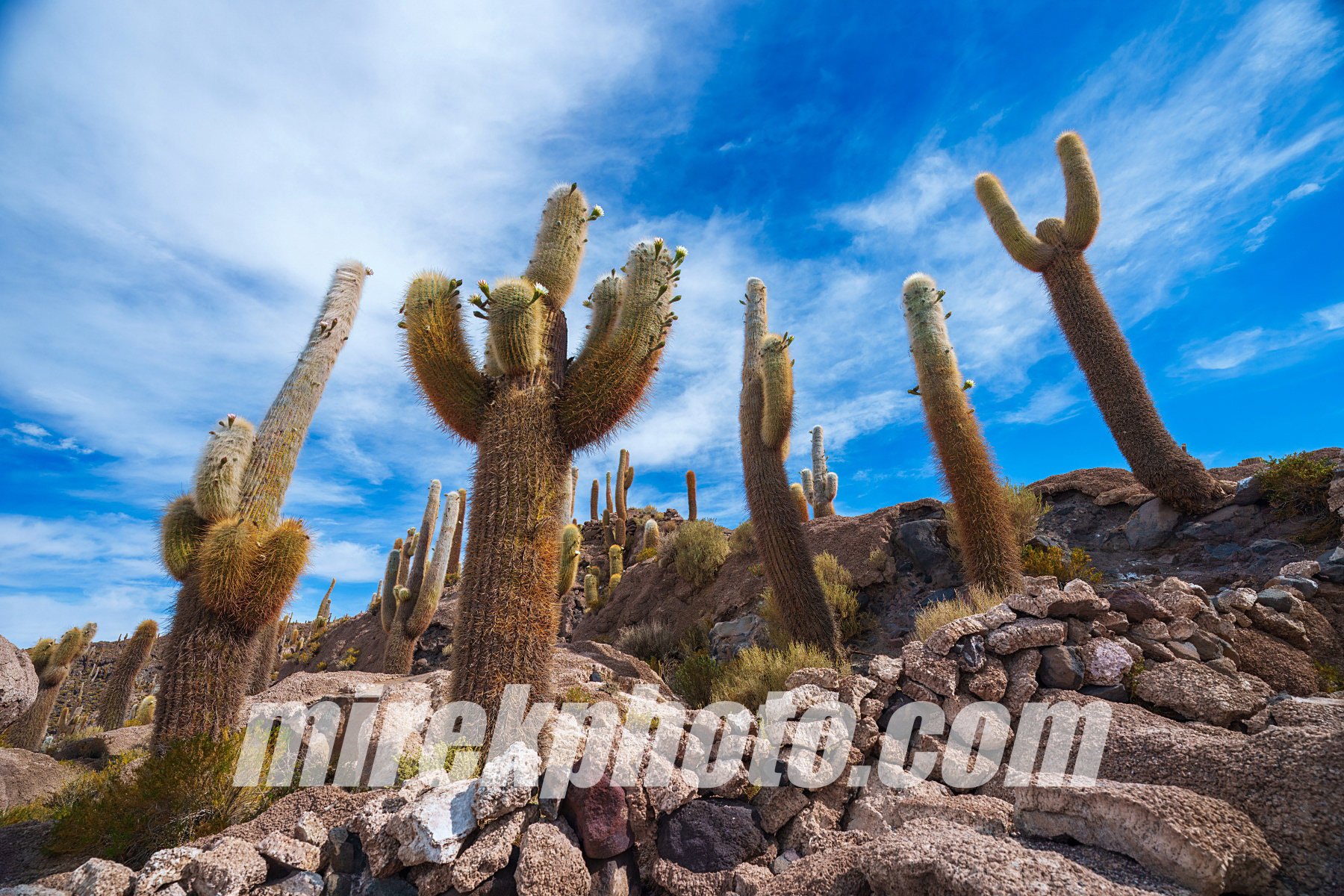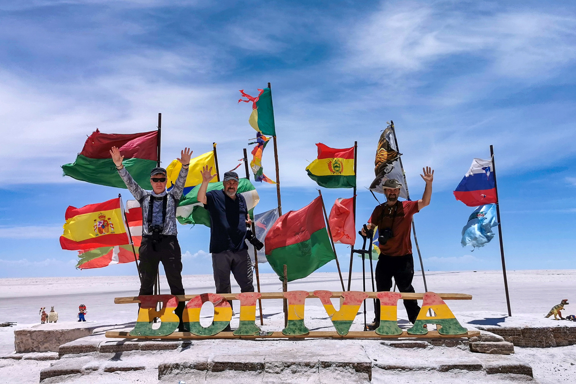 Na autobusovém nádraží v Uyuni už na nás čekalo auto i s řidičem a my jsme vyrazili na jihozápad Bolívie. Po krátké zastávce na hřbitově lokomotiv míříme rovnou směrem k největší solné poušti světa – Salar de Uyuni. Tato solná pláň je jedno z nejkrásnějších míst na světě. Její rozloha je přes 10 000 km² a nachází se v nadmořské výšce kolem 3 650 m n. m. Během období dešťů se pokrývá tenkou vrstvou vody a stává se z ní největší zrcadlo světa. Uprostřed této pouště se najednou z ničeho nic objeví ostrov, který je celý porostlý kaktusy. A to ne ledajakými! Je to kaktusový les, kde jsou rostliny obrovské, některé z nich jsou dokonce přes tisíc let staré. A většina z nich právě kvetla.